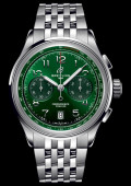 | Plus de caractéristiques : | Mouvement Calibre : calibre Manufacture Breitling 01 Diamètre : 30 mm Epaisseur : 7,2 mm Remontage : mécanique à remontage automatique, bidirectionnel avec roulement à billes Réserve de marche : environ 70 heures Nombre de composants : 334 Alternance : 28 800 a/h ou 4 hertz Chronographe : roue à colonnes, embrayage vertical, ¼ de seconde, poussoir 30 minutes et poussoir 12 heures Boitier Acier Inoxydable Cadran Vert avec compteurs de chronographe ton sur ton Bracelet / Boucles Bracelet à 7 rangs en acier inoxydable à fermoir papillon |