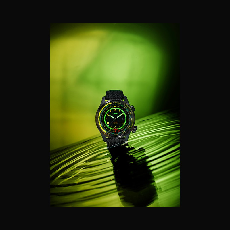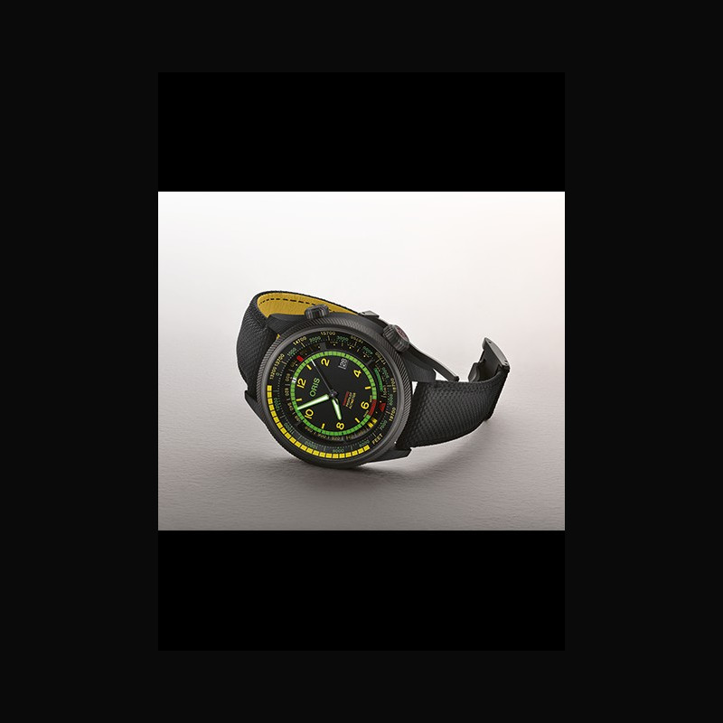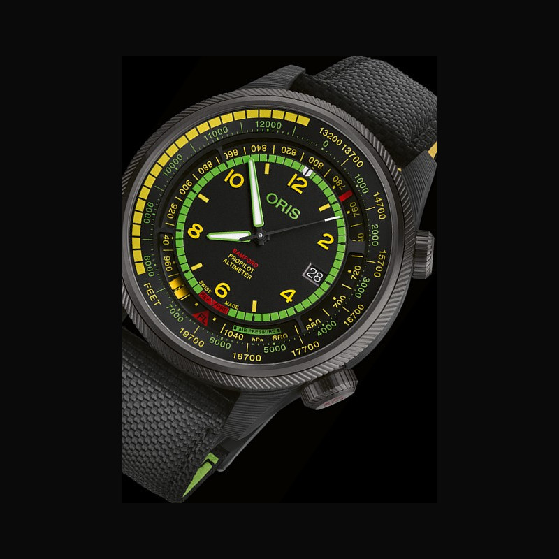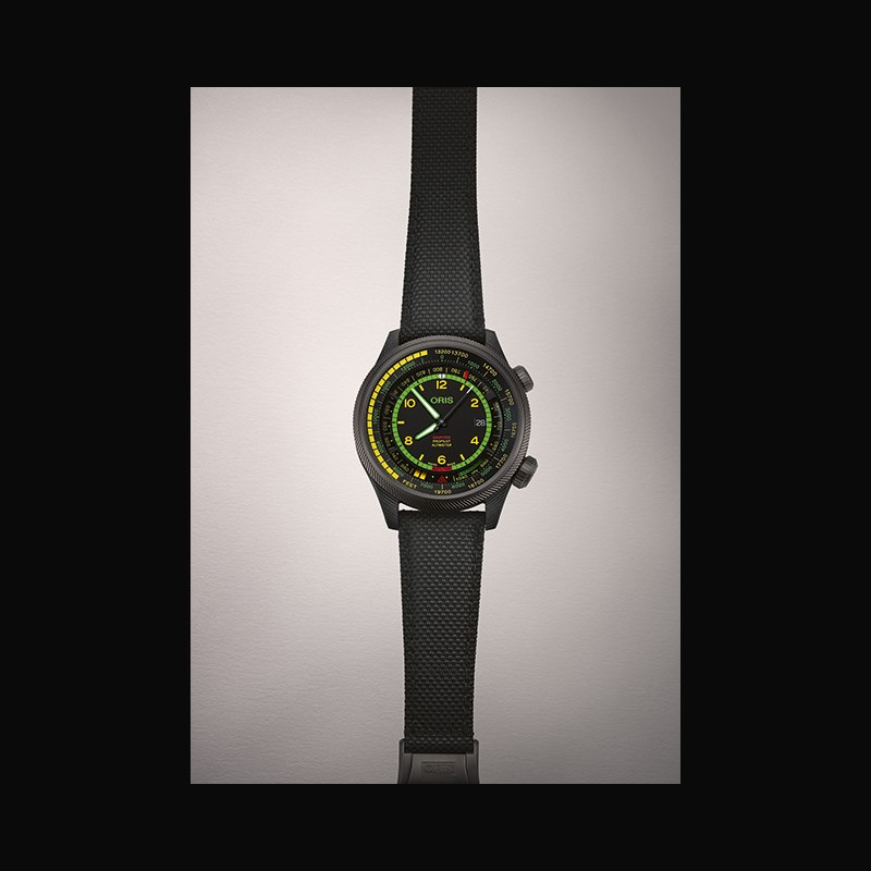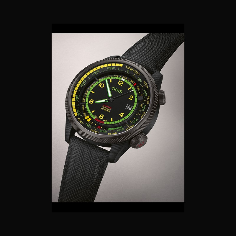 | Plus de caractéristiques : | Mouvement Numéro Oris 793 Remontage Automatique Réserve de marche 56 heures Boitier Monobloc en composite de fibre de carbone Corne à corne 55.00 mm Cadran Noir avec détails jaunes, verts et rouges, échelle d’altitude en pieds sur la lunette intérieure du cadran Bracelet / Boucles Textile noir avec doublure en cuir jaune et vert, boucle déployante en titane gris traité PVD avec système de réglage fin Edition Limitée 250 pièces, numérotées 001/250 Disponibilité Septembre |