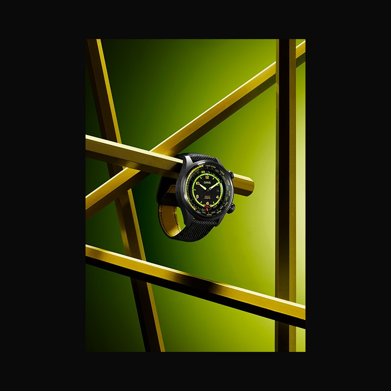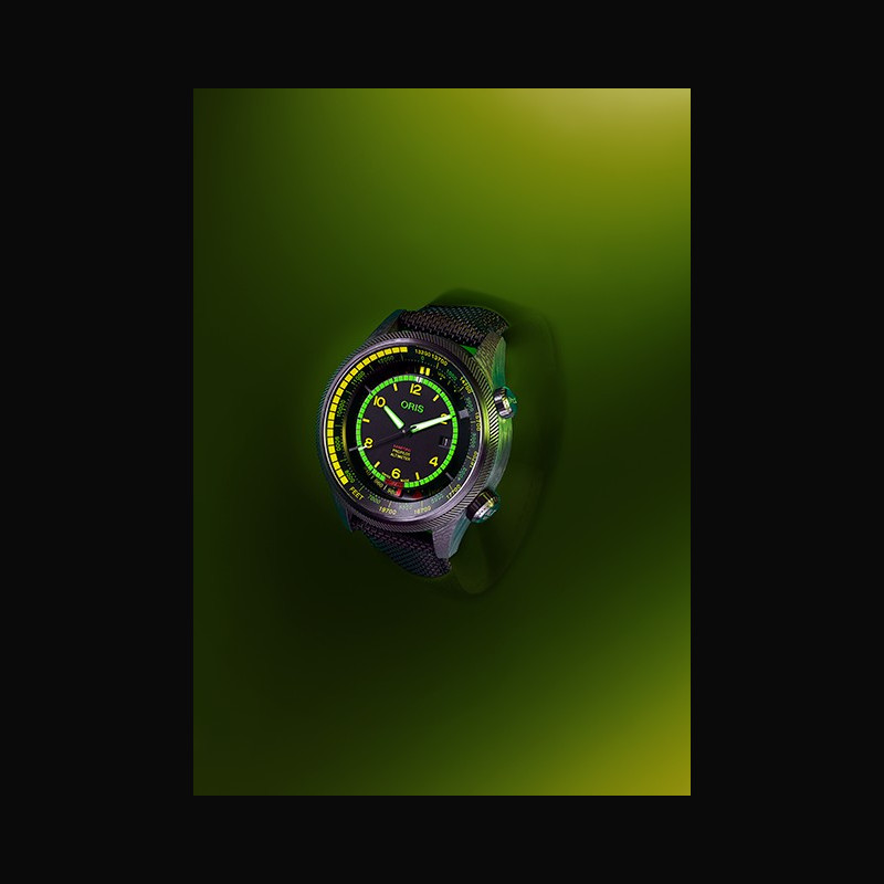 Si l’innovation d’Oris visait le ciel, la réinterprétation de cette montre par le Bamford Watch Department (BWD) la propulse au-delà des frontières, vers l’infini. En jouant avec une base noire comme l’espace, BWD a ajouté des touches de couleurs vives et contrastées, renforçant la lisibilité et apportant à la montre une personnalité totalement inédite.