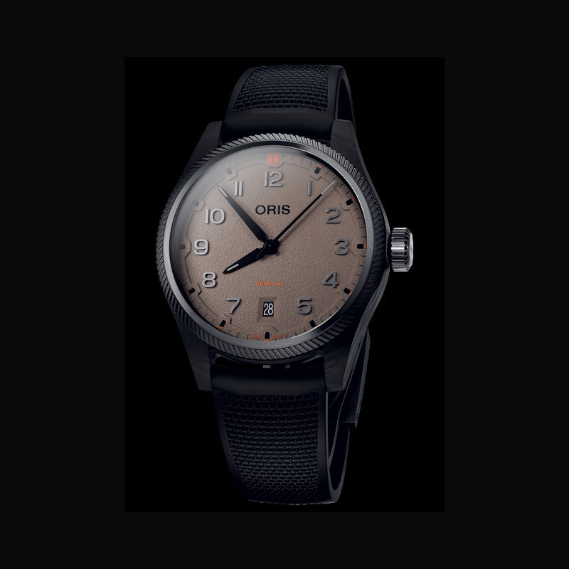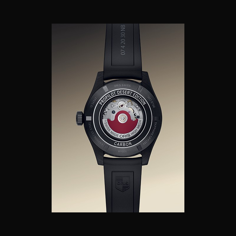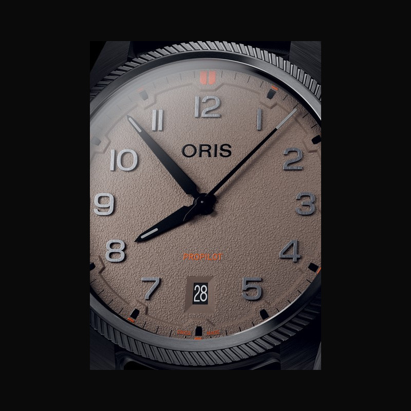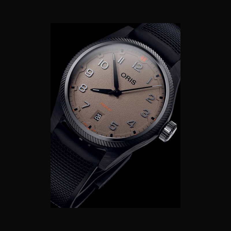 À l'occasion de la Dubaï Watch Week, nous avons le grand plaisir de vous présenter la ProPilot Desert Edition, une version spéciale de la ProPilot Date récemment mise à jour, l'un de nos modèles contemporains sur le thème de l'aviation. Le boîtier de la nouvelle ProPilot Date a été redessiné afin d'obtenir une silhouette plus prononcée avec des lignes épurées et nettes, tandis que la lunette, les chiffres appliqués et les aiguilles affinées ont été retravaillés pour offrir un look plus moderne et dynamique. Pour cette édition Desert, le boîtier de 41,00 mm a été fabriqué en fibre de carbone, à l'aide d'une technique innovante de fabrication et de moulage mise au point par les ingénieurs d'Oris. Il est monté sur un bracelet hybride en caoutchouc et textile noir, avec une nouvelle version du célèbre fermoir « LIFT » de la ProPilot Date, qui a été redessiné pour plus de raffinement et un réglage simplifié. Ensemble, ces éléments offrent une ergonomie et une facilité d'utilisation de premier ordre, même dans des conditions extrêmes. La couronne, la lunette surdimensionnée et le fond du boîtier sont en acier inoxydable et recouverts d'un revêtement PVD gris assorti à la couleur du boîtier et des cornes en fibre de carbone. La montre est également dotée d'un cadran grainé « sable beige » inspiré de la couleur et de la texture du désert, tandis que les aiguilles et les chiffres noirs très contrastés assurent une excellente lisibilité. Les détails rouge vif soulignent le caractère aventureux de la montre. Tout a été pensé pour offrir un confort et des performances améliorés.