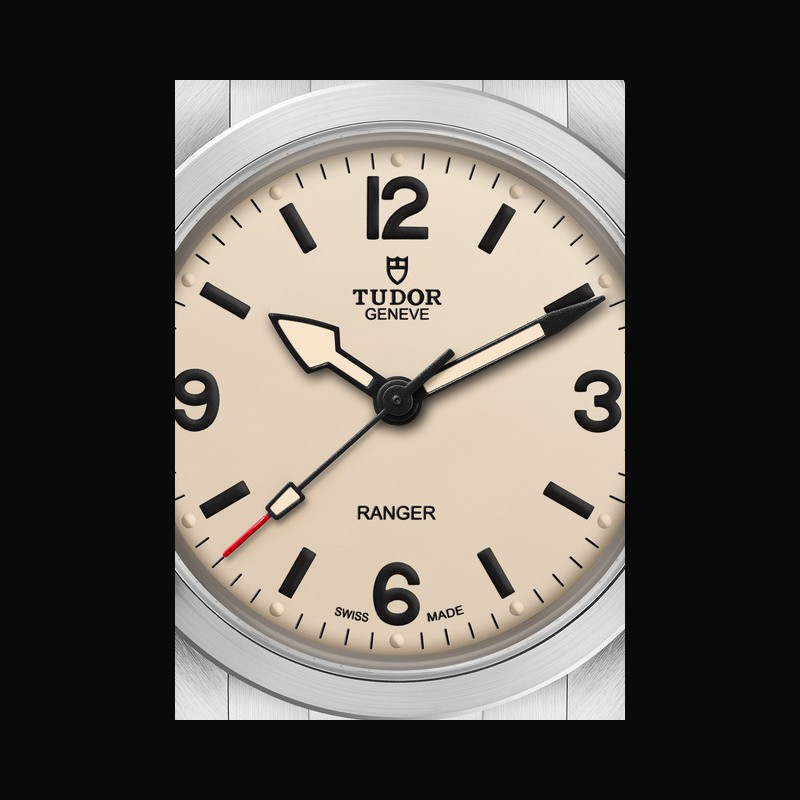 Les aiguilles en forme de flèche, arrondies pour les heures et angulaires pour les secondes, sont caractéristiques de l’esthétique Ranger, avec la signature TUDOR : une extrémité de trotteuse traitée en bordeaux.