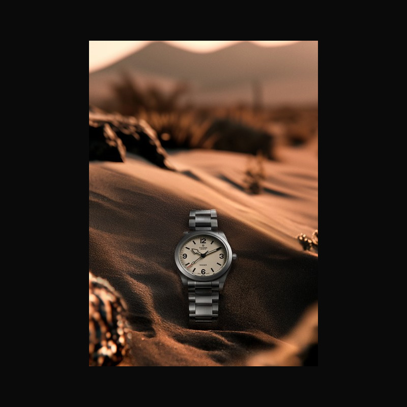 Un bracelet en tissu dʼune seule pièce dans les tons terre est également proposé sur les modèles Ranger. Tissé de manière artisanale sur des métiers Jacquard à navette du XIXe siècle par l’entreprise Julien Faure dans la région de Saint‑Étienne, en France, sa qualité, sa robustesse et son confort au porter sont uniques.