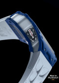 Gracieuse et ergonomique, la RM 35-03, proposée en deux versions – Quartz TPT® bleu avec carrure en Quartz TPT® blanc et Quartz TPT® blanc et Carbone TPT® avec carrure en Carbone TPT® –, présente des échancrures inspirées de la RM 27-04 Tourbillon. Entièrement squeletté, le mouvement se laisse admirer des deux côtés du boîtier au travers de verres saphir. La platine et les ponts, architecturés en titane grade 5 et traités électro-plasma gris et PVD, accentuent le caractère graphique de la pièce. Les aiguilles squelette pointent sur le rehaut également en titane grade 5 microbillé, ponctué des chiffres 3, 6, 9, 12 inclinés vers le mouvement pour créer toujours plus de profondeur.