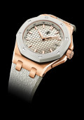 Enfin, la dernière nouveauté est un modèle Royal Oak Offshore Chronographe Automatique en acier inoxydable de 43 mm conçu pour la première fois avec une lunette également en acier ainsi que des poussoirs et une couronne en céramique noire. Inspiré par les habanos, ce garde-temps se disitingue par un cadran Méga Tapisserie au ton bronze inédit. Décoré d’un effet fumé, celui-ci s’assombrit vers l’extérieur pour se terminer sur le réhaut noir sur lequel est imprimé le tachymètre en blanc. Faisant écho à la céramique et au réhaut, les compteurs de chronographe à 9h, 6h et 3h sont déclinés en noir pour une lisibilité renforcée. Le cadran est encore complété par des index et aiguilles trapézoïdaux luminescents en or noirci. Porté sur un bracelet en alligator marron et arborant une finition Oxford patinée à la main, ce modèle doté du système d’interchangeabilité s’accompagne d’un bracelet supplémentaire en caoutchouc noir pour un style plus sportif.