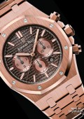La nouvelle gamme de chronographes lancée cette année propose un retour vers un design particulièrement prisé qui a fait son apparition en 2008. À l'image des modèles vintage créés entre les années 30 et 60, les cadrans des chronographes Royal Oak ont toujours bénéficié d’une exécution irréprochable. Les sept modèles de la série 2017 arborent un cadran bicolore aux détails aussi subtils qu’inédits : l’angle du guichet date, les compteurs surdimensionnés à 3 heures et 9 heures, les index plus courts et plus larges, le revêtement luminescent plus épais pour une lisibilité accrue, sans oublier les nouveaux caractères et décalques.
