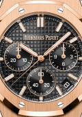 | Affichage : | Compteurs noirs Index appliqués et aiguilles Royal Oak en or rose avec dépôt luminescent |