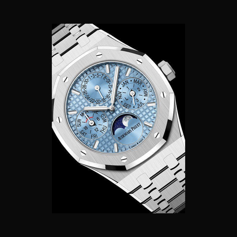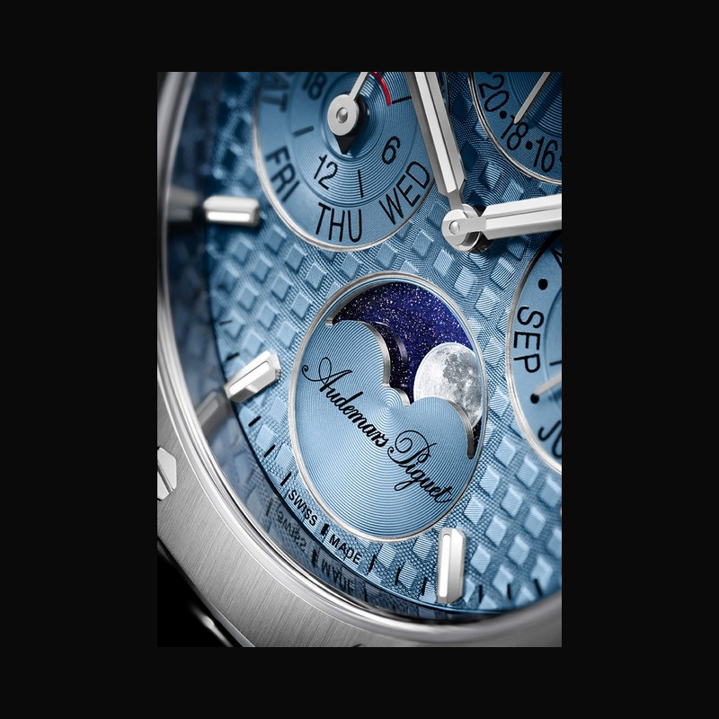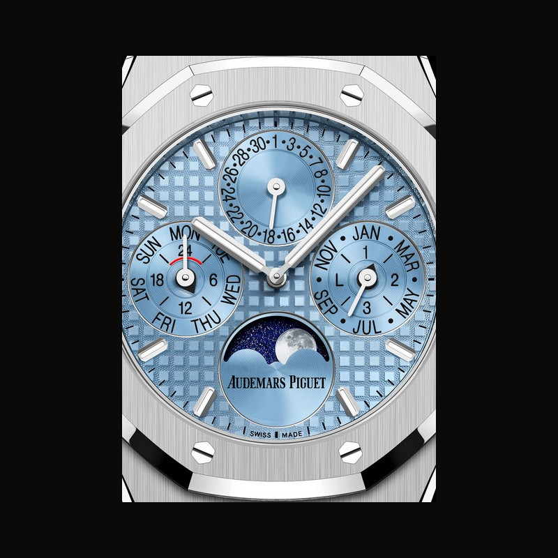 Deux calibres mêlant complexité technique et simplicité d’utilisation animent ces nouveautés. D’une part, le Calibre 7138 présenté début 2025 dans les modèles à quantième perpétuel de 41 mm et d’autre part, le tout nouveau Calibre 7136 qui diffère du premier par l’absence de semainier. Dans un cas comme dans l’autre, Audemars Piguet a entièrement repensé le mécanisme astronomique pour l’aborder sous l’angle ergonomique afin d’adapter cette complication au style de vie actuel.