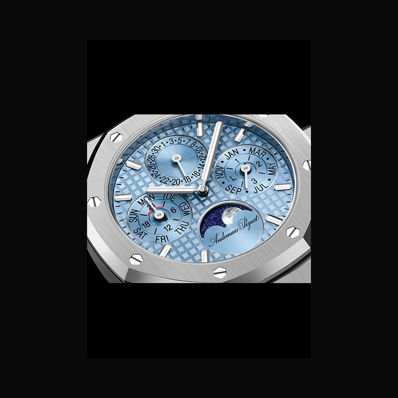 Le premier modèle Royal Oak marie une boîte et un bracelet en acier inoxydable à un cadran Grande Tapisserie en PVD bleu clair assorti aux compteurs azurés. Les index rhodiés et les aiguilles en or gris 18 carats couverts d’un revêtement luminescent assurent le contraste et la lisibilité, même dans l’obscurité. Les indications imprimées en noir sur les compteurs et en périphérie du réhaut gris poli ajoutent la touche finale.