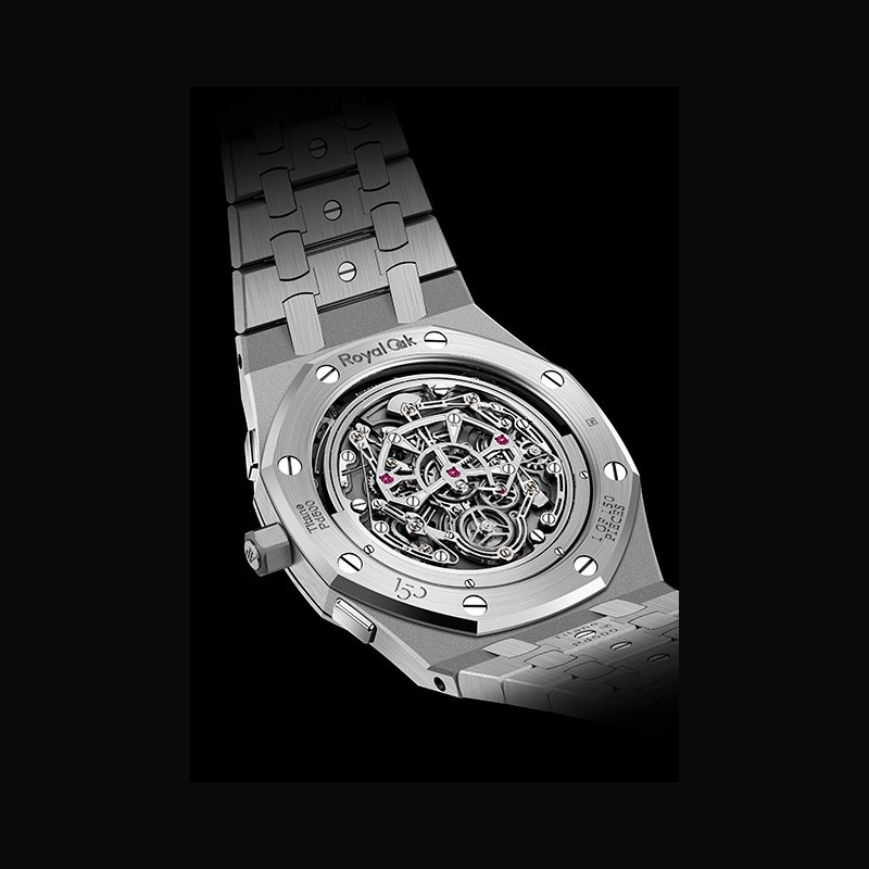 Pour célébrer cette année anniversaire, la signature de cadran Audemars Piguet spécialement développée pour l’occasion sur la base de documents d’archives trône à 12h Le fond de boîte porte quant à lui les gravures «1 of 150 pieces» ainsi que le logo «150» ans, renforçant le caractère exceptionnel de ce garde-temps qui marie héritage et innovation.