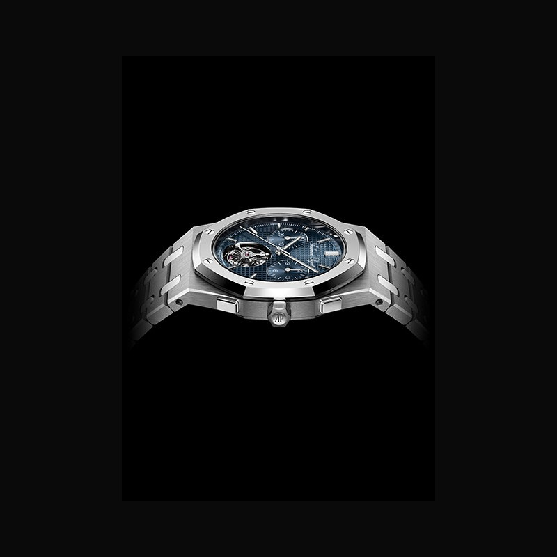 Pour la première fois de son histoire longue de plus de 50 ans, la Royal Oak «Jumbo» accueille en son cœur un mécanisme mariant un chronographe automatique à un tourbillon volant. Une double complication inédite qui a représenté un défi considérable pour les équipes d’Audemars Piguet compte tenu des dimensions de ce modèle iconique. Lancée en 1972 et conçue par Gérald Genta, la première Royal Oak est surnommée «Jumbo» en référence à ses dimensions jugées larges pour l’époque. Aujourd’hui prisée des collectionneurs, elle incarne l’ergonomie parfaite avec ses 39mm de diamètre et ses 8,1mm d’épaisseur. Un critère qui en fait la candidate idéale pour ce nouveau développement dans lequel la mécanique se met au service du design. En gardant en tête le confort de l’utilisateur et la nécessité de respecter scrupuleusement les codes esthétiques de la ligne, les équipes du département Recherche & Développement ont entièrement repensé la construction du chronographe pour offrir une sensation au toucher d’une finesse inédite, tout en réduisant au maximum l’épaisseur du mécanisme. Il en résulte un garde-temps mêlant complexité technique, simplicité d’utilisation et sobriété esthétique.