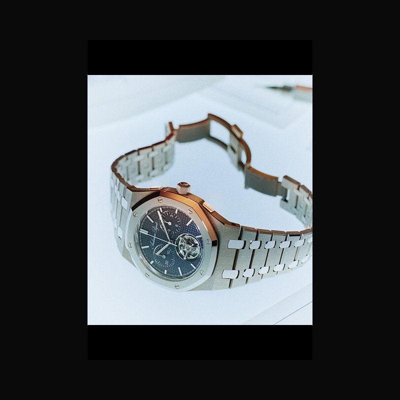 Outre ces innovations, le nouveau Calibre 8100 dispose d’un tourbillon volant ainsi qu’un nouvel embrayage par roue à déplacement vertical. Mélangeant embrayage traditionnel dont il conserve les roues dentées et embrayage à friction, ce nouveau dispositif permet à la roue d’embrayage de se déplacer verticalement, supprimant les rotations parasites et limitant les sauts. Le calibre est également doté d’une roue à colonne qui permet de piloter précisément les séquences de l’embrayage et du frein, et de répartir les forces avec fluidité, notamment celles du poussoir marche et arrêt. Pour le poussoir de remise à zéro, un système breveté 2 , à la fois compact et ingénieux, permet d’emmagasiner l’énergie jusqu’à un point de bascule précis. Une fois ce seuil atteint, une bascule centrale libère simultanément tous les compteurs en isolant les obstacles qui les retiennent, permettant à chaque aiguille de revenir à zéro sous l’action de sa crémaillère, assurant une transition nette et parfaitement synchronisée. Au dos de la montre, les équipes d’Audemars Piguet ont développé une masse oscillante périphérique en platine, permettant de gagner en épaisseur et offrant une vue dégagée sur la cinématique du mouvement aux finitions raffinées telles que l’anglage manuel des ponts de chronographe, les angles rentrants ou encore le satinage. Disposant d’une réserve de marche de 72h, ce chronographe robuste s’adapte aisément au style de vie moderne, permettant notamment de pratiquer des activités sportives sans risque de se dérégler.