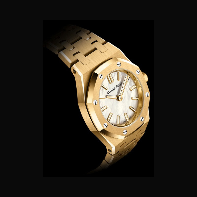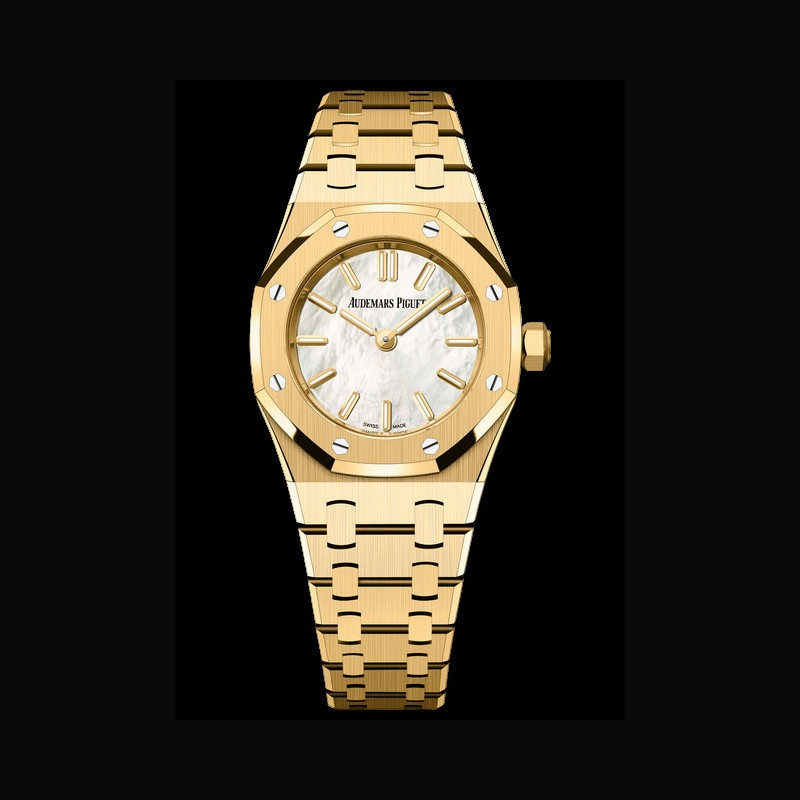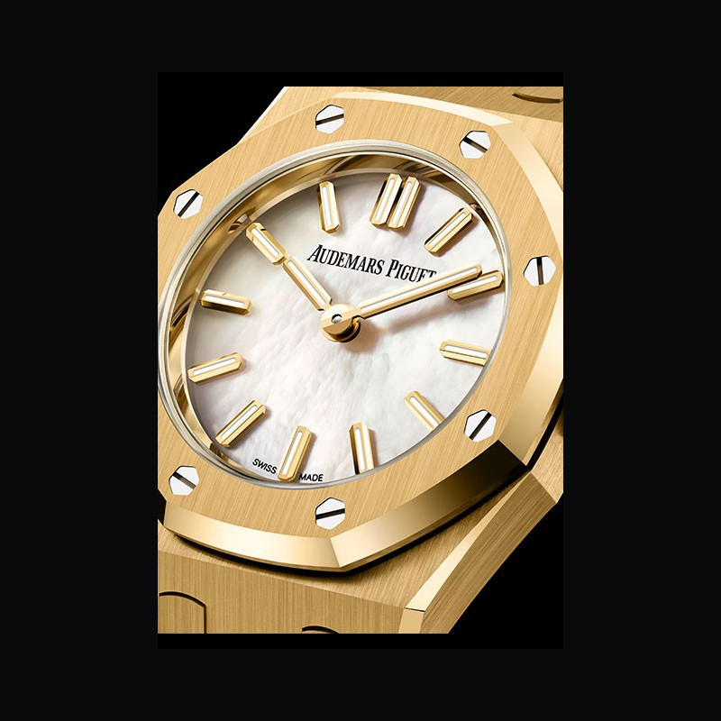 Le second modèle présente un cadran en nacre extra-blanche, encadré par une boîte et un bracelet en or jaune 18 carats. Appréciée pour ses reflets irisés et son origine naturelle, la nacre occupe une place de choix dans l’horlogerie et la joaillerie pour sa féminité, son éclat et sa durabilité. Si Audemars Piguet l’a déjà utilisée dans certaines créations, son retour au sein de la collection Royal Oak signe une redécouverte de ce matériau intemporel. L’association de l’or jaune et de la nacre évoque les modèles Royal Oak historiques tout en introduisant une esthétique actuelle et lumineuse.