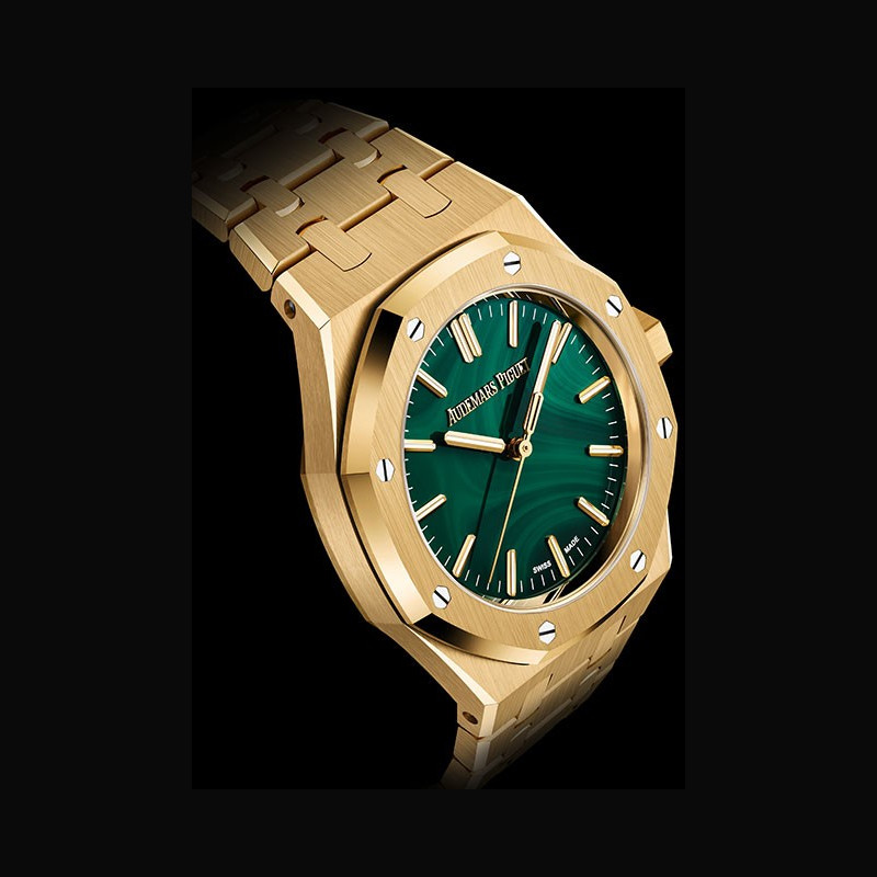 La Manufacture suisse de Haute Horlogerie Audemars Piguet est heureuse d’annoncer deux nouvelles références Royal Oak Automatique. Entièrement conçues en or jaune et déclinées dans des diamètres de 37 mm et 41 mm, ces deux pièces sont agrémentées d’un nouveau cadran minéral réalisé en malachite.