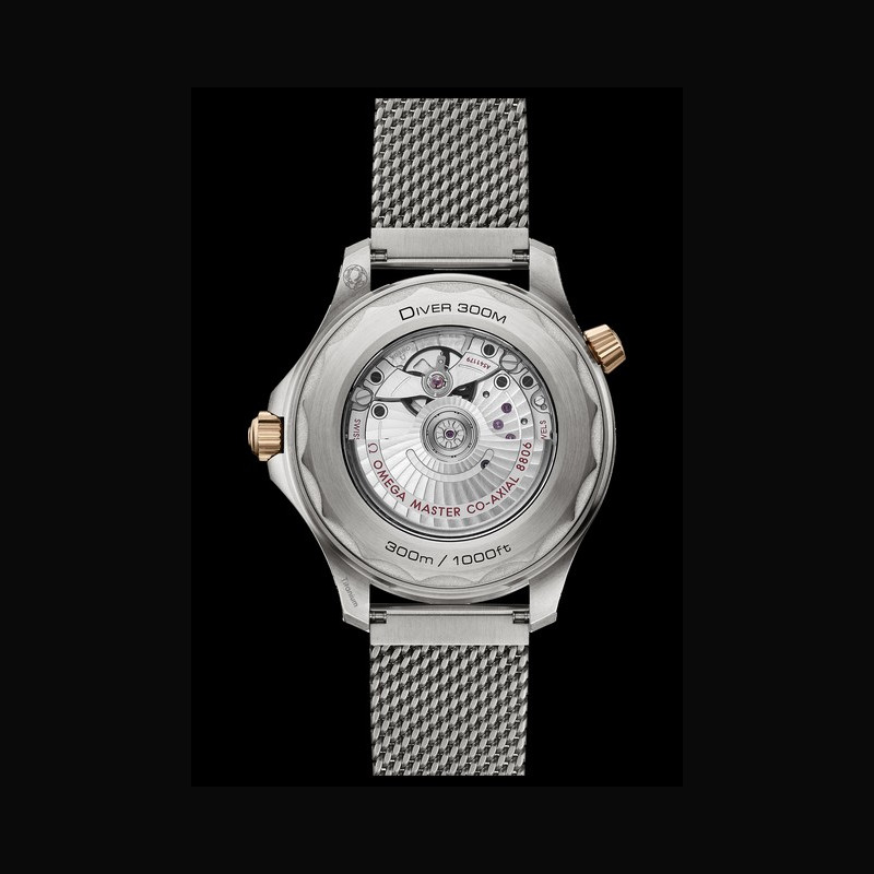 Avec un contraste saisissant, le Bronze Gold exclusif d’OMEGA est utilisé pour la lunette, la couronne, la valve à hélium et le revêtement en PVD Bronze Gold des aiguilles. Cet alliage unique a été conçu pour conserver sa patine naturelle au fil du temps, sans devenir vert en raison de l’oxydation des couches. En plus d’offrir une teinte rose clair durable, il est exempt de nickel, ce qui le rend anallergique et sans fer, ce qui améliore la résistance magnétique.