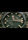 La combinaison de ces deux matériaux est complétée par l’utilisation d’aluminium vert. Cela inclut le cadran avec ses index noircis revêtus de Super-LumiNova vintage, ainsi que la lunette en aluminium anodisé oxalique, avec son échelle de plongée également en Super-LumiNova vintage.