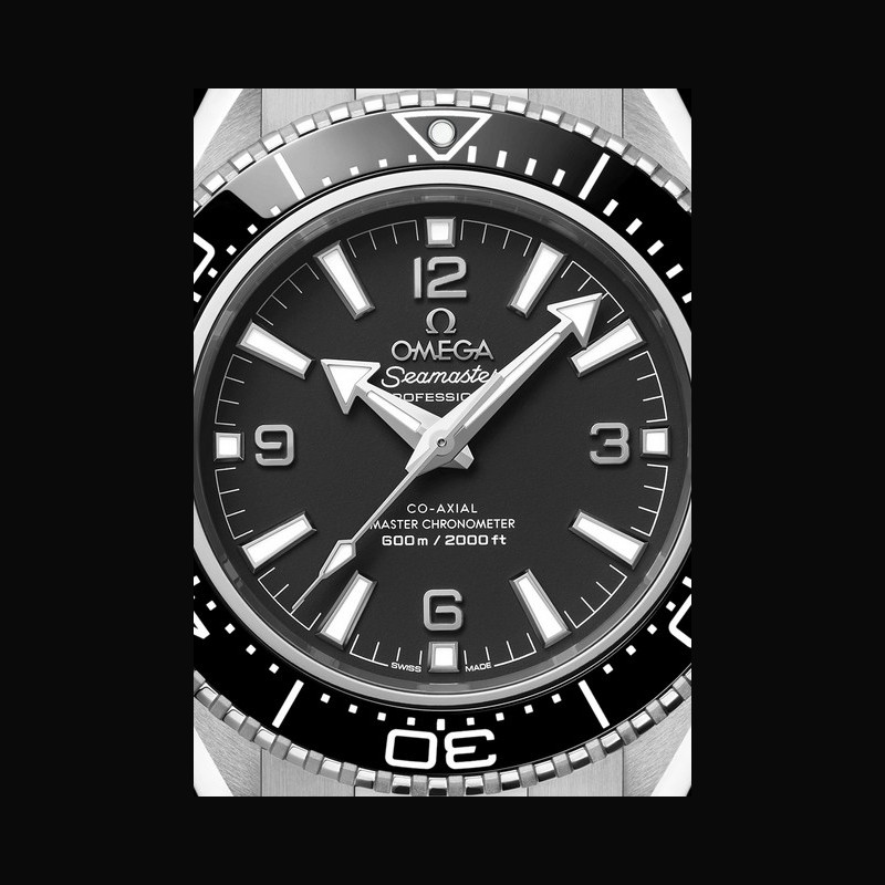 Chaque cadran de la nouvelle collection Planet Ocean est noir mat. OMEGA a conservé les aiguilles flèche et les index appliqués audacieux remplis de Super-LumiNova, mais une différence nouvelle est la typographie des chiffres arabes.