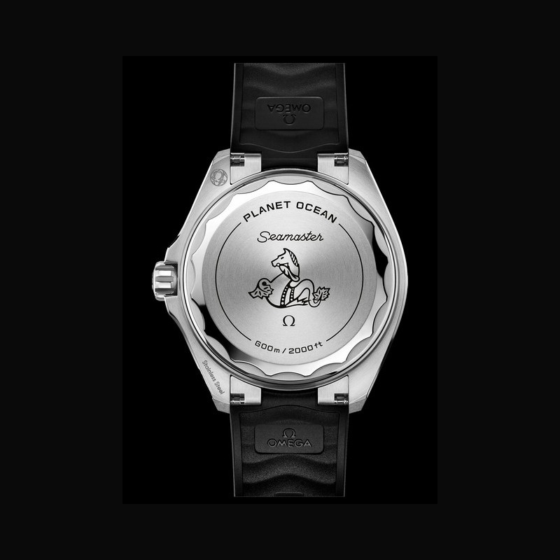 Le design du fond présente un bord ondulé, avec les gravures PLANET OCEAN et SEAMASTER, une indication de l’étanchéité, ainsi que l’emblème iconique de l’hippocampe OMEGA gravé au centre.
