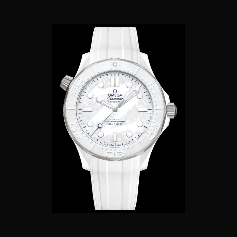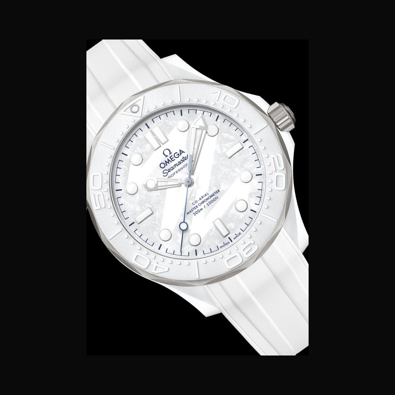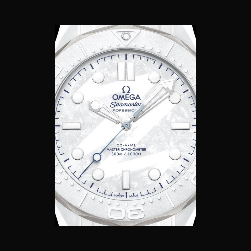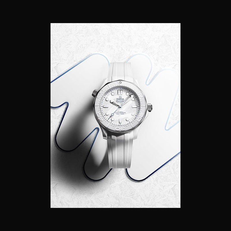 Inspiré par l’hiver, OMEGA a imaginé une création en céramique blanche et titane grade 5, deux matériaux associant beauté épurée, légèreté et résistance. Leurs finitions variées font naître des contrastes qui illuminent l’ensemble de la pièce : carrure polie/satinée, valve à hélium et couronne sablées, mais aussi lunette en céramique blanche avec échelle de plongée en relief gravée au laser.