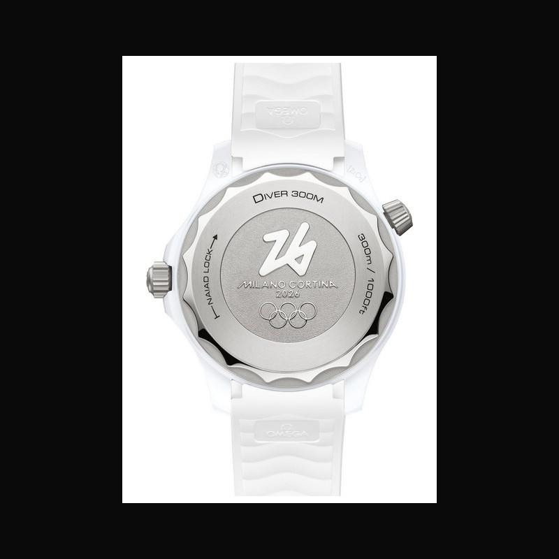Sur le cadran, OMEGA a créé un décor unique en l’honneur de ces Jeux Olympiques d’hiver. Façonné en céramique blanche, il est orné d’un effet givré gravé au laser et d’un motif trace de doigt inspiré par le « 26 » de l’emblème de Milano Cortina 2026. Pour compléter l’ensemble, les aiguilles et index rhodiés sont revêtus de Super-LumiNova blanc, tandis que l’aiguille centrale des secondes est vernie d’un subtil dégradé de bleu, une couleur que l’on retrouve aussi sur le logo de l’événement.