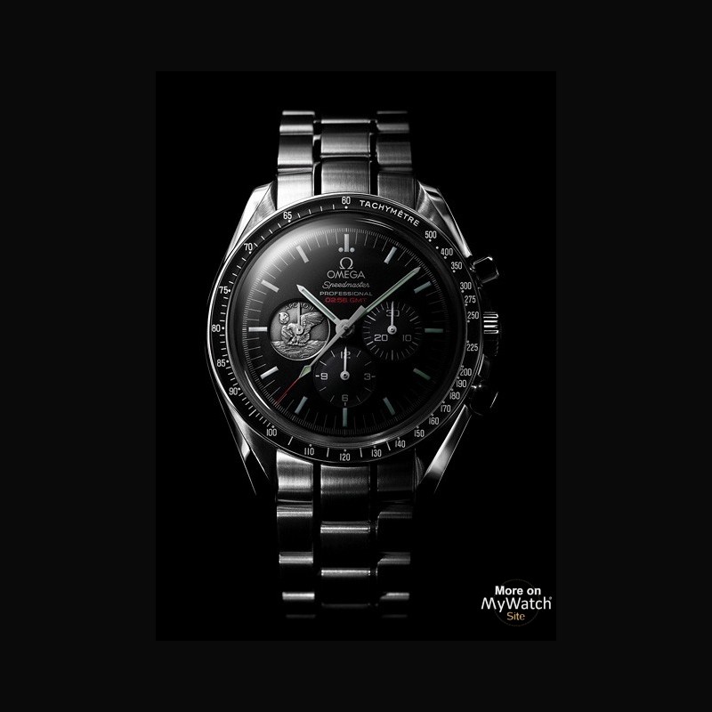 Le cadran noir rappelle celui de la Speedmaster Professional Moonwatch - avec quelques différences significatives toutefois : le compteur des petites secondes présente, sous la forme d’une petite médaille, une adaptation du fameux logo de la mission Apollo 11 représentant un aigle s’apprêtant à se poser sur la lune et tenant dans ses serres un rameau d’olivier (symbole de paix) avec la terre se profilant en arrière-plan. Le logo de cette mission avait été dessiné par Michael Collins, le pilote du module de commande. Troisième homme de l’équipage, Collins était resté dans la capsule Apollo 11 alors qu’Armstrong et Aldrin posèrent pied sur la lune grâce au module lunaire.