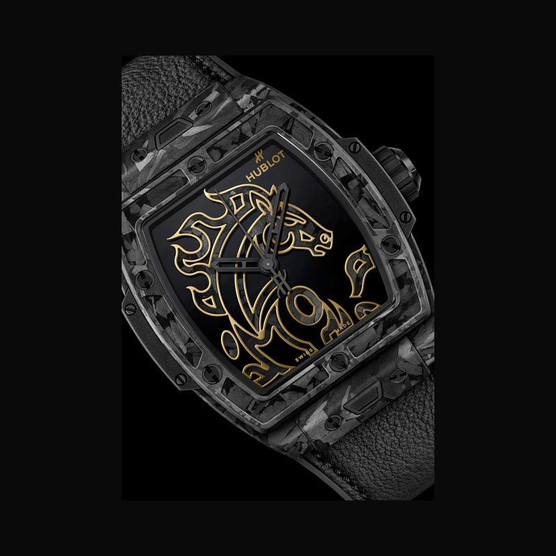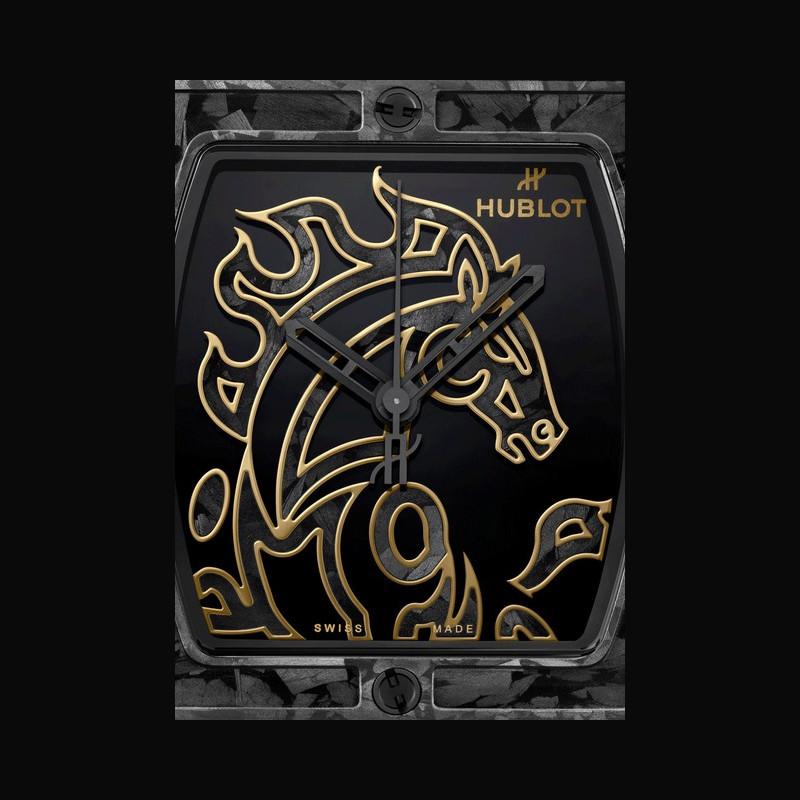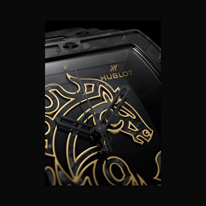 Hublot a transformé l’un de ses matériaux haute performance, à savoir le carbone, en une véritable signature visuelle. Le cadran associe une marqueterie en carbone posée à la main à des appliques en laiton plaqué or 3N formant un motif cheval. Chaque fragment de carbone est découpé, aligné et assemblé à la main, et permet ainsi de démontrer la maîtrise totale de l’un des matériaux les plus exigeants de l’horlogerie moderne. Les lignes d’or en trois dimensions, inspirées des broderies à fil droit des anciennes robes cérémonielles chinoises, confèrent au cheval une présence imposante. Le boîtier de forme tonneau de 42 mm est confectionné en carbone noir mat. Une base en laque noire amplifie le contraste et la profondeur, tandis que le fond de boîtier en saphir fumé et le bracelet en cuir de veau et caoutchouc noir renforcent l’identité affirmée de la montre.