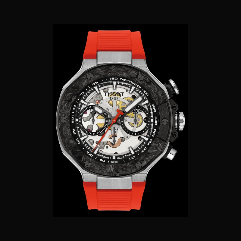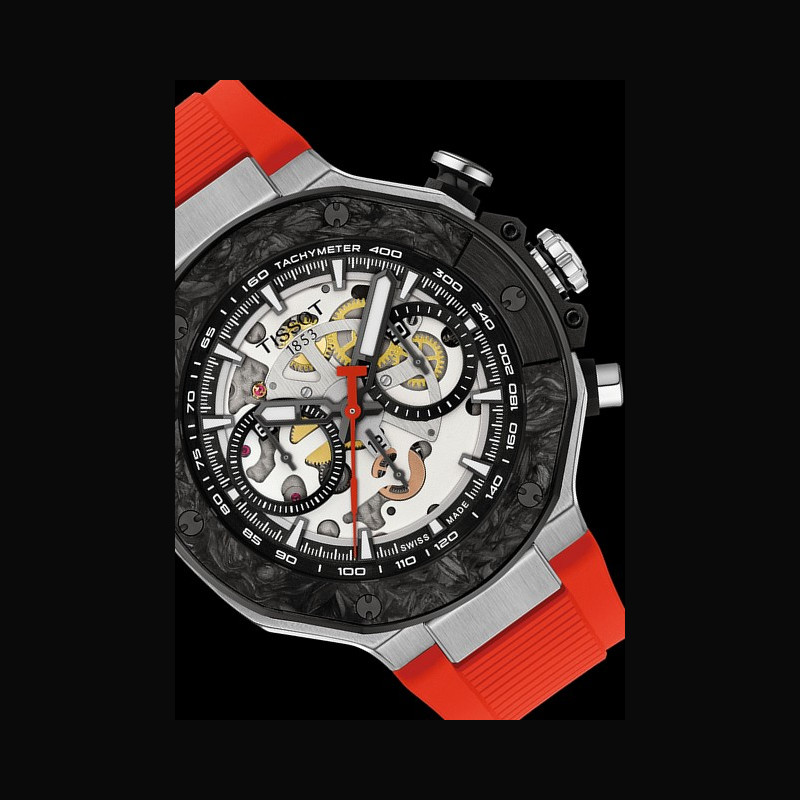 En complément de l’édition automatique, le chronographe à quartz T-Race MotoGP Édition Limitée apporte sa propre interprétation dynamique de la performance à grande vitesse. Sa boîte noire de 45 mm, dotée d’un traitement antireflet, améliore la lisibilité et attire le regard sur l’audacieux cadran rouge, rehaussé de détails en Super-LumiNova®. Le design présente des contrastes marqués et des lignes précises qui évoquent le mouvement et la tension des courses de compétition.