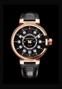 | + Plus de caractéristiques : | Mouvement Calibre LV111 Développé et assemblé par la Manufacture La Fabrique du Temps Louis Vuitton Affichage de 2 fuseaux horaires ; l’heure de référence grâce aux cubes Spin Time et l’heure locale grâce à l’aiguille des heures Cubes en aluminium 35.20 mm de diamètre (15’’’1/2) 233 composants 42 heures de réserve de marche 28 800 oscillations par heure (4Hz) 27 rubis Boîte Carrure en aluminium céramisé (black MMC) Lunette. cornes et couronne en or rose 18 carats Bracelet Alligator et veau noir surpiqûre rouge et doublure en veau noir Boucle ardillon en or rose 18 carats |