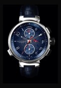 | Plus de caractéristiques : | Mouvement Réalisé par La Fabrique du Temps Louis Vuitton Réserve de marche 48h Fonctions Chronographe et Régate (affichage du compte à rebours en 5mn) Cadran Saphir bleu. logo Louis Vuitton Cup |