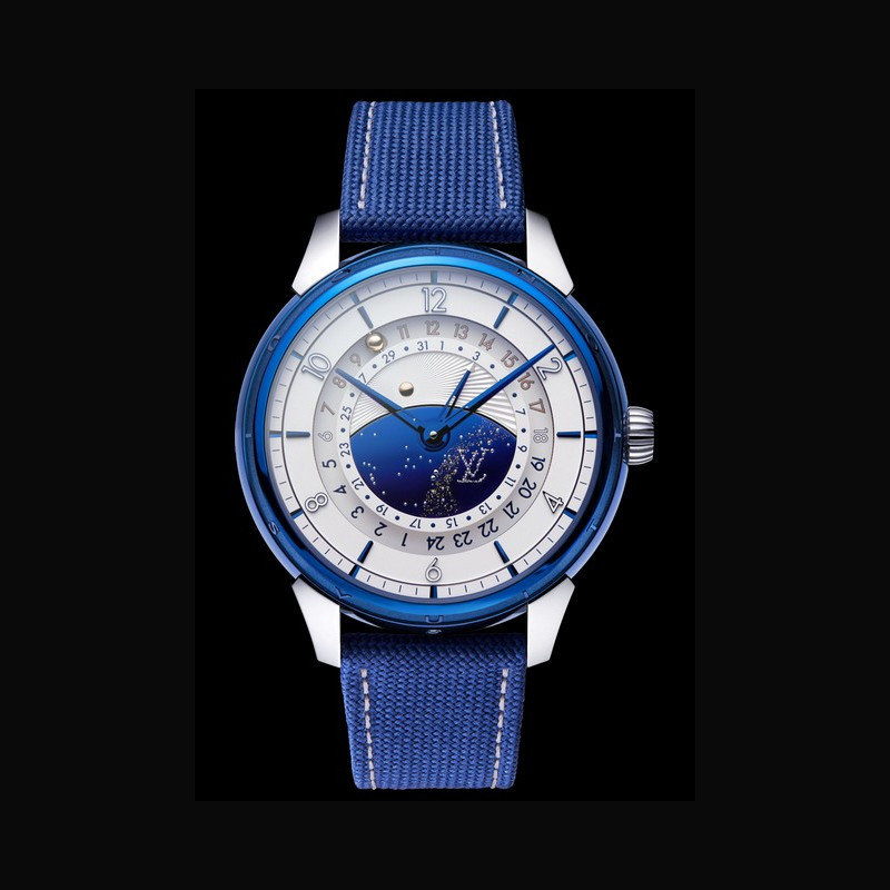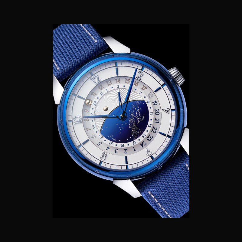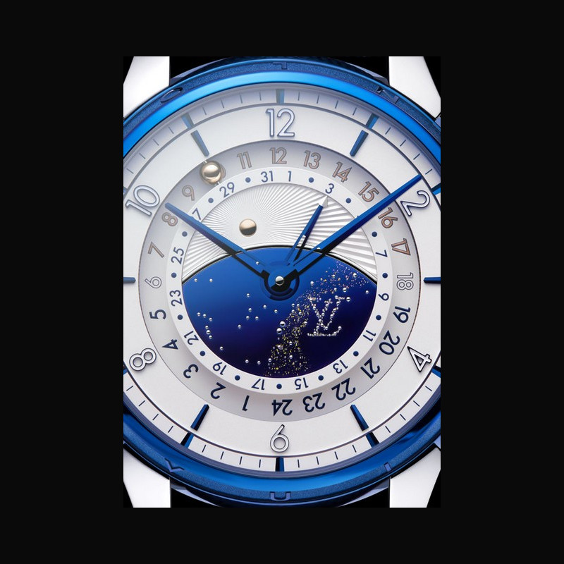 | Affichage : | Disque des heures format 12h (heure locale) Disque de second fuseau horaire format 24h indication jour/nuit par sphère or rose et acier bleui Cadran central en titane bleui; constellation Louis Vuitton avec goupilles en or blanc et voie lactée à la feuille d’or; soleil en or rose Aiguilles des heures et des minutes en laiton diamanté PVD bleu; aiguille de date en laiton diamanté PVD bleu avec flèche argentée |