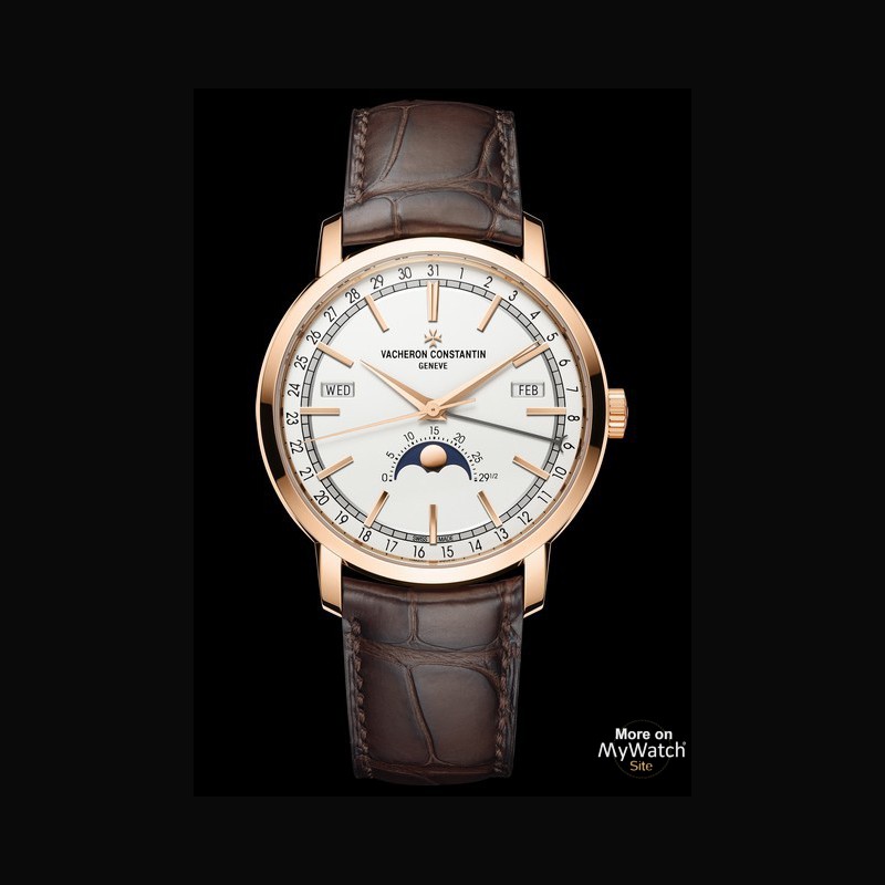 Pourvue d’une complication aussi utile que raffinée, cette montre Traditionnelle à l’élégance classique s’équipe d’un mouvement mécanique à remontage automatique – le calibre 2460 QCL – entièrement développé et manufacturé par Vacheron Constantin. Son boîtier de 41 mm de diamètre en or rose 18 carats 5N en abrite les 308 composants, ainsi qu’une masse oscillante en or 22 carats visible à travers le fond en saphir. Battant à la fréquence de 4 Hz, pour une réserve de marche d’environ 40 heures, ce mécanisme offre les fonctions heures, minutes et secondes centrales, calendrier complet (jour de la semaine, date et mois), phase de lune de précision et l’indication de l’âge de la lune. D’une précision remarquable, l’indication de la phase de lune ne requiert qu’un seul ajustement tous les 122 ans (contre trois ans pour une phase de lune simple). L’équilibre et la lisibilité du cadran opalin argenté, ponctué d’index et d’aiguilles dauphines bi-facettées en or, sont renforcés par une disposition inédite des guichets des jours de la semaine et des mois, placés en périphérie du cadran. La date est quant à elle indiquée par une fine aiguille centrale noire.