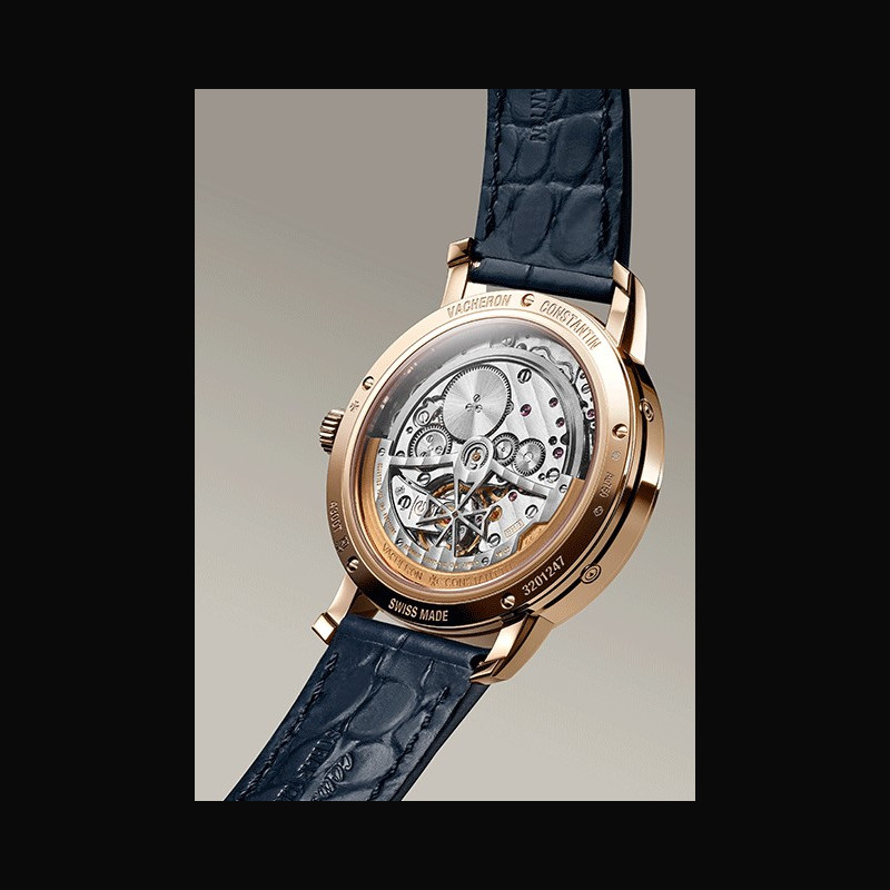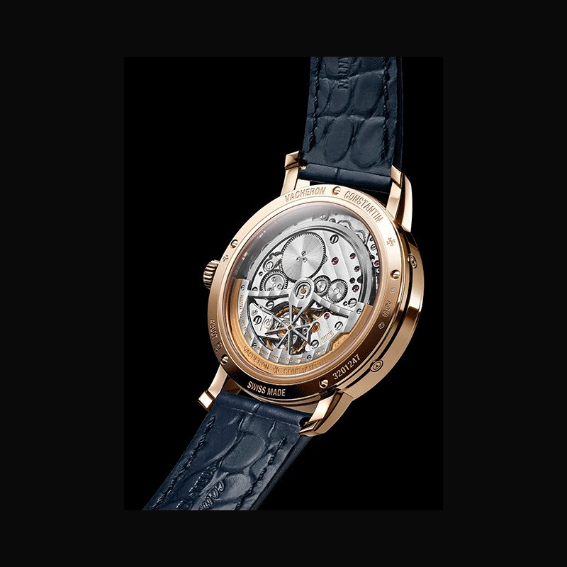 | Plus de caractéristiques : | Mouvement Calibre 1120 QP Développé et manufacturé par Vacheron Constantin Mécanique à remontage automatique Diamètre de 29,6 mm (12 ½’’’), épaisseur de 4,05 mm Réserve de marche d’environ 40 heures 2,75 Hz (19’800 alternances/heure) 276 composants 36 rubis Boitier Or rose 18K Cadran Opalin argenté Bracelet / Boucles Alligator Mississippiensis bleu foncé, surpiqûres ton sur ton Boucle Ardillon en or rose 18K 5N Montre certifiée Poinçon de Genève Emblème du 270e anniversaire sur les pièces produites en 2025 |
