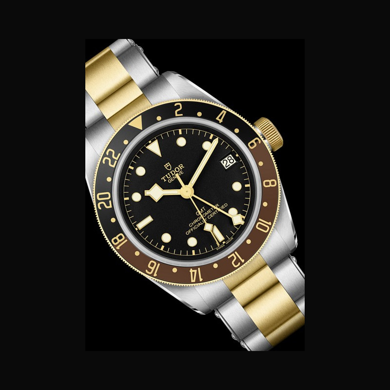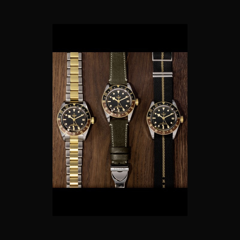Pour Black Bay GMT S&G, c’est un bracelet noir avec bande beige qui a été choisi par TUDOR et tissé par cet artisan. Le modèle est également disponible monté sur bracelet en acier et or jaune inspiré des bracelets pliés à rivets des montres TUDOR fabriquées dans les années 1950 et 1960. Leurs particularités étaient d’avoir les têtes de rivets de fixation des maillons apparentes sur la tranche du bracelet ainsi qu’une « fuite en escalier ». Ces deux détails esthétiques se retrouvent dans le bracelet actuel qui bénéficie toutefois d’une construction moderne avec maillons massifs et têtes d’axes finies au laser, façon rivet. Enfin, la Black Bay GMT offre encore une option en cuir marron avec surpiqûres claires et boucle déployante.