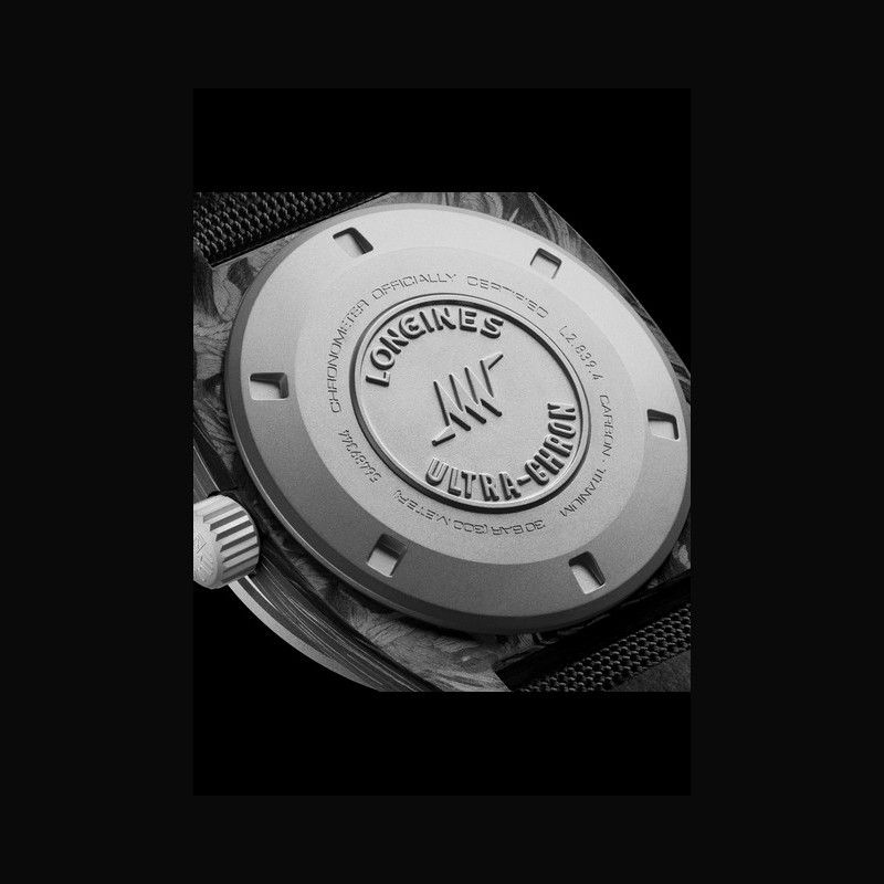 La collection ULTRA-CHRON s’habille de carbone : un ma- tériau innovant à la fois robuste et léger, utilisé pour la pre- mière fois dans le boîtier d’une montre Longines. Animé par un mouvement haute fréquence Longines exclusif battant à 36 000 alternances par heure, ce modèle s’inspire d’une montre iconique de 1968 à l’incomparable boîtier en forme de coussin. Alliant innovation et précision, chaque ULTRA-CHRON CARBON offre un design unique et est cer- tifiée chronomètre dans son ensemble par TIMELAB.