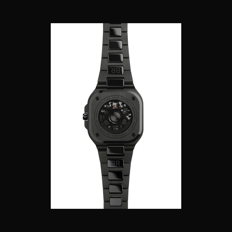 La BR-05 Skeleton Black Ceramic poli satinée se différencie par son cadran transparent teinté faisant apparaître le mouvement mécanique à remontage automatique BR-CAL.321 à la finition en ruthénium noir.