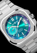 La BR-X5 Iridescent dévoile un visage inédit. Comparable aux ailes du papillon ou aux fascinantes écailles des poissons tropicaux, la couleur du cadran évolue comme par magie au gré de l’éclairage ou de l’inclinaison du garde temps. Bleuté aux reflets irisés, il offre une grande palette de couleurs passant du bleu au vert puis du vert au bleu avec des touches de jaune et de violet. Le cadran se transforme ainsi en un véritable nuancier, rappelant les teintes d’un arc-en-ciel. Sa palette de couleurs unique évolue au moindre changement d’orientation du poignet.