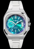 | + Plus de caractéristiques : | Mouvement Calibre BR-CAL.323 Manufacture. Mécanique automatique Réserve de marche de 70 heures environ Boitier Acier poli-satiné Cadran Irisé du vert au violet Bracelet / Boucles Acier poli-satiné ou caoutchouc blanc Boucle: déployante. Acier poli-satiné |
