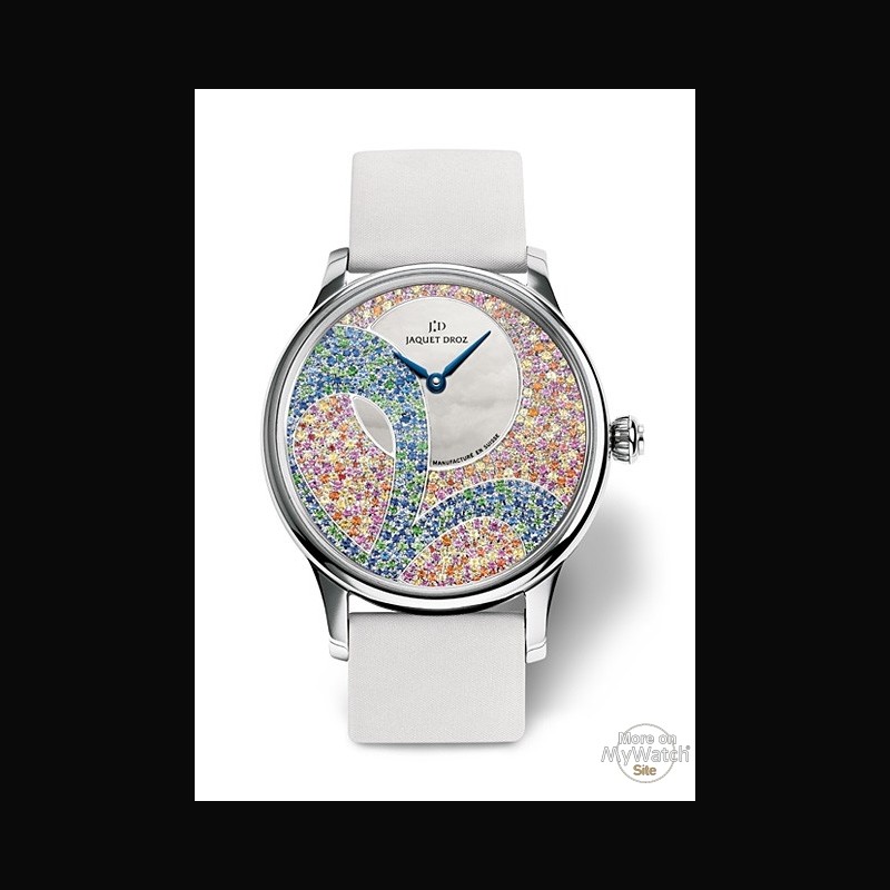 | Plus de caractéristiques : | Mouvement Double barillet Masse oscillante en or gris 22 carats 28 rubis Fréquence : 28 800 alternances / heure Réserve de marche : 68 heures Boîtier en or gris 18 carats Numéro individuel de la série limitée gravé sur le fond Cadran serti neige 24 saphirs jaunes 175 saphirs bleus 125 saphirs roses 129 saphirs oranges 93 tsavorites Bracelet en satin rembordé à la main Boucle en or gris 18 carats |