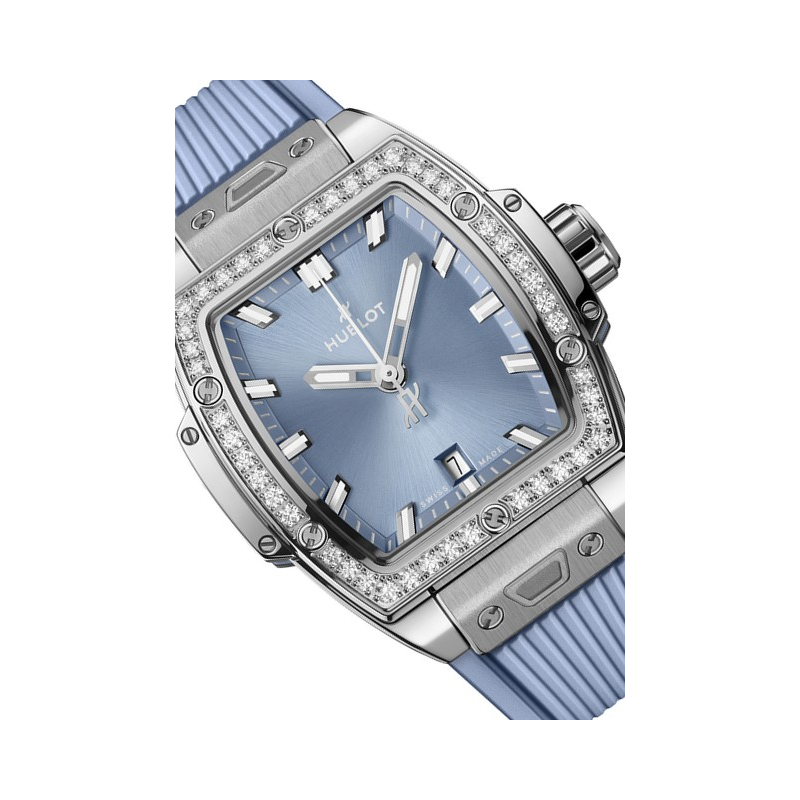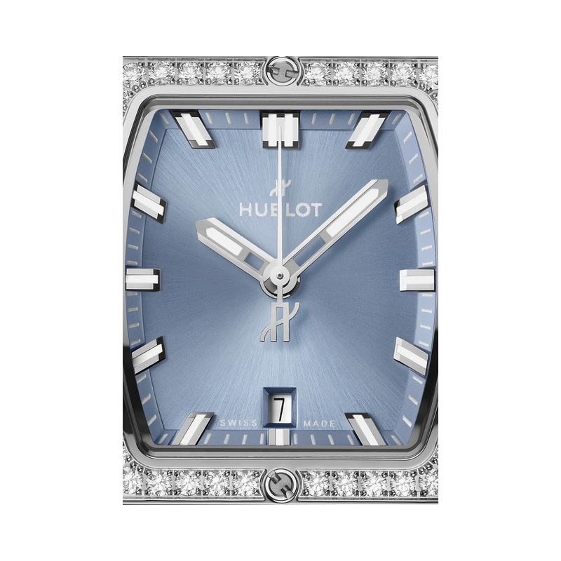 Cette teinte exclusive, un bleu saturé aux nuances orageuses et minérales, révèle ses reflets naturels sous une certaine incidence à la lumière. Une tonalité rare, difficile à capturer. Elle emprunte ses composantes à la fois au gris, au noir et au bleu. L’alchimie est délicate. Hublot s’est attaché à fusionner sa profondeur minérale et, dans le même temps, son éclat naturel.