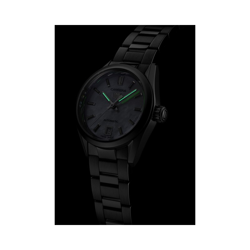 La TAG Heuer Carrera Date 29 mm automatique Calibre 9, présente elle aussi un nouveau boîtier avec des cornes affinées et un nouveau bracelet avec des maillons en forme de H. Pour plus de lisibilité, le cadran est parcouru par des aiguilles plus imposantes alors que des nouveaux index affinés inspirés de la Carrera d’origine reflètent la lumière. La ligne de 29 mm de diamètre avec date à 6 heures intègre une nouvelle version raffinée avec des index en diamant.
