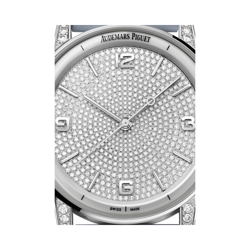 Le modèle en or gris arbore un réhaut rhodié, alors que la version en or rose présente un réhaut doré rose. Les index en or gris ou rose – dont l’application a représenté un défi technique en raison de la finesse du cadran serti – ajoutent une touche sophistiquée.