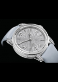 Le cadran en or gris ou rose 18 carats est entièrement serti de 612 diamants taille brillant (~2,3 carats) méticuleusement choisis pour former un effet harmonieux une fois assemblés. Chaque cadran est composé de 6 diamètres de pierres différents, s’échelonnant de ~0,65 à ~1,10 mm, et évoluant du plus petit au plus grand au fur et à mesure que le sertissage grain1 se rapproche de la périphérie du cadran. Les jeux de lumière engendrés par les diamants sont magnifiés par la glace saphir doublement incurvée qui crée une expérience optique unique.
