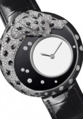 Véritable sculpture joaillière en trois dimensions, le félin au pelage de diamants et de taches de laque noire, se love autour du cadran. Tête, pattes, yeux d’émeraudes, le réalisme est d’autant plus saisissant qu’il s’oppose à la transparence du cadran où gravitent les aiguilles, heures suspendues qu’actionne l’invisible calibre 9981 MC.