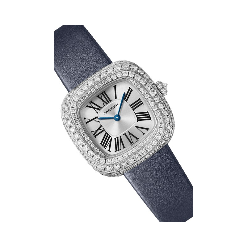 | + Plus de caractéristiques : | Mouvement Quartz Boitier Or gris 750/1000 Boîte sertie de 176 diamants taille brillant (3,97 cts) Bracelet Veau bleu Les bijoux Cartier sont en or 750/1000 ou en platine 950/1000. Le caratage des pierres de centre est mentionné à titre indicatif et peut varier légèrement. |