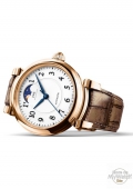 La Da Vinci Automatic Phase de Lune 36 est proposée en trois modèles : l’un en or rouge, un autre avec boîtier en acier fin et lunette sertie de diamants et enfin un dernier modèle en acier fin. Tous trois sont dotés d’un cadran argenté. La version en or rouge 18 carats (réf. IW459308) est un véritable bijou. Cette pièce en or affiche un boîtier de 36 millimètres, des cornes de bracelet proéminentes, une couronne demi-boule et un bracelet de couleur bronze en alligator de Santoni fermant à l’aide d’une boucle ardillon.La phase de lune dorée sur fond bleu vient souligner cet ensemble harmonieux. Alors que la durée réelle d’un mois lunaire est de 29,53 jours, la construction classique d’une phase de lune avec rouage ne compte que 29,5 jours. Une fois par jour, le rouage fait avancer le disque automatiquement d’une dent, afin de représenter correctement la phase de lune. Au besoin, l’affichage peut être actualisé au moyen du poussoir de correction à « 2 heures » et d’une tige livrée avec la montre.