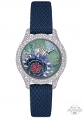 Leur cadran orné de pierres précieuses, de nacre, d’opales et d’éléments en or poli, témoigne d’un savoir-faire joaillier d’exception. Leur boîtier délicatement pavé de diamants en serti neige cristallise la poésie colorée du cadran. Leur bracelet aux lignes ondulées, en tissu bleu nuit, les inscrit dans une modernité propre à la Maison.
