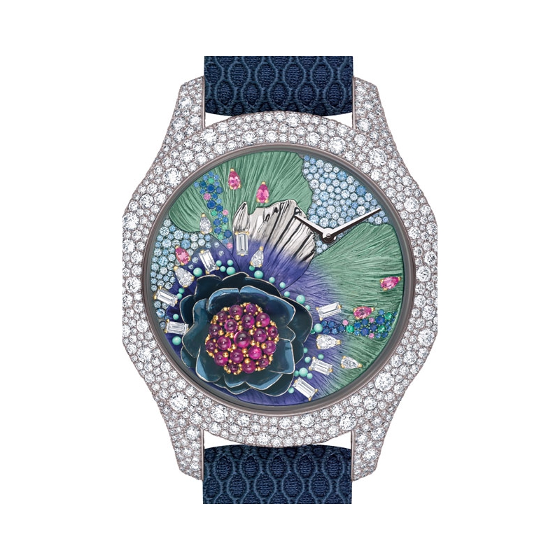 La collection Dior Grand Soir dévoile 8 nouvelles pièces uniques inspirées d’un jardin féerique aux fleurs fantastiques. Ces gardes temps précieux jouent avec les volumes, et donnent l'illusion que la fleur pousse sous la glace.