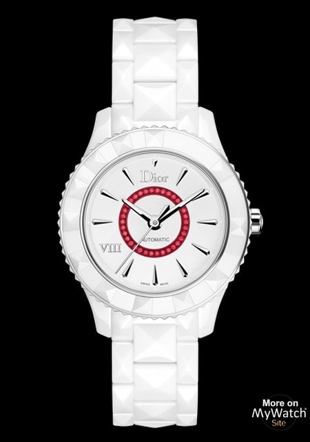 | + Plus de caractéristiques : | Mouvement Masse oscillante laquée rouge Réserve de marche de 38 heures Boîtier Céramique high-tech blanche et acier inoxydable Cadran Cercle central serti de rubis Réhaut argenté opalin avec index luminescents Aiguilles des heures et des minutes facettées luminescentes Bracelet Céramique high-tech blanche Maillons façonnés en forme de pyramide Boucle déployante en acier Composition 34 rubis Environ 0.18 carat |