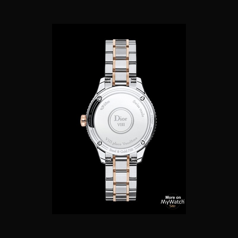 | Particularité du boitier : | Lunette en acier ornée d'une bague en or rose Fond en acier gravé Couronne en or rose gravée « CD » |