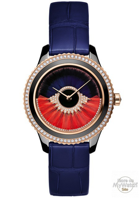 | Plus de caractéristiques : | Mouvement Calibre «Dior Inversé 11 1/2 » Masse oscillante fonctionnelle en or rose côté cadran, sertie de diamants taille brillant et ornée de plumes rouges (brevetée) Réserve de marche de 42 heures Composition Or rose 750/1000e/ Poids (moyen) : 35,49 g Diamants : 198 / Carat (approx.) : 1,04 / Pureté : V.V.S. / Couleur : FG Fonction Heures -Minutes Boîtier Lunette en or rose sertie de diamants taille brillant et ornée d’une bague en céramique noire Couronne sertie d’un insert en céramique noire Fond en cristal saphir translucide noir Cadran Cadran laqué rose orné de deux rangs de marqueterie de plumes noires et bleues Aiguilles des heures et des minutes facettées en or rose Bracelet Alligator semi-mat bleu foncé Boucle ardillon en or rose sertie de diamants taille brillant |