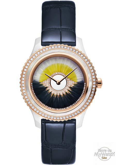 | + Plus de caractéristiques : | Mouvement Calibre «Dior Inversé 11 1/2 » Masse oscillante fonctionnelle en or rose côté cadran, sertie de diamants taille brillant et ornée de plumes grises anthracites (brevetée) Réserve de marche de 42 heures Composition Or rose 750/1000e/ Poids (moyen) : 35,49 g Diamants : 198 / Carat (approx.) : 1,04 / Pureté : V.V.S. / Couleur : FG Fonction Heures -Minutes Boîtier Lunette en or rose sertie de diamants taille brillant et ornée d’une bague en nacre blanche Couronne sertie d’un insert en céramique blanche Fond en cristal saphir opalescent Cadran Cadran laqué couleur parme orné de deux rangs de marqueterie de plumes blanches et jaunes Aiguilles des heures et des minutes facettées en or rose Bracelet Alligator semi-mat bleu marine Boucle ardillon en or rose sertie de diamants taille brillant |